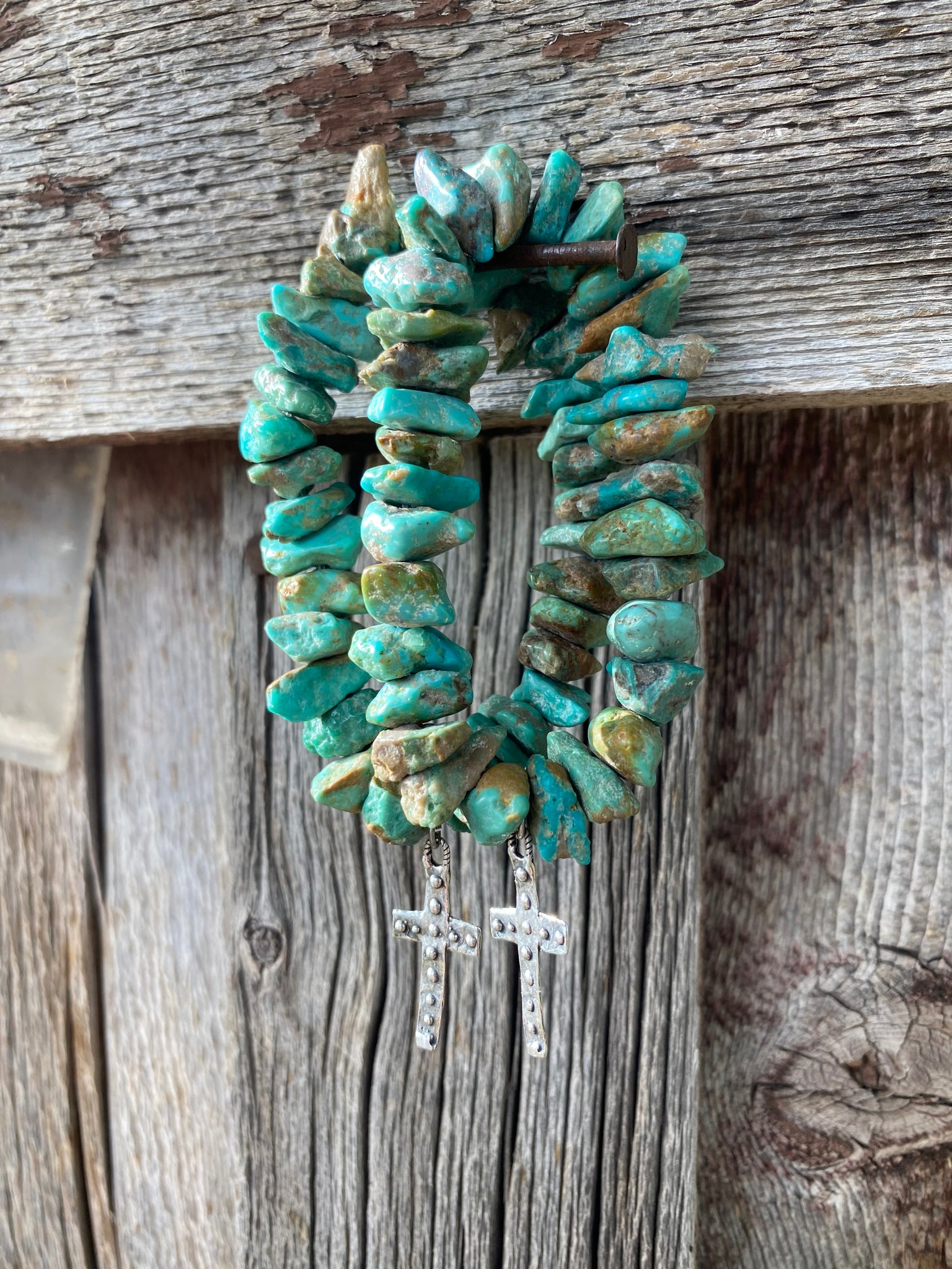 Campitos Turquoise nugget beads with a sterling silver dotted cross charm
